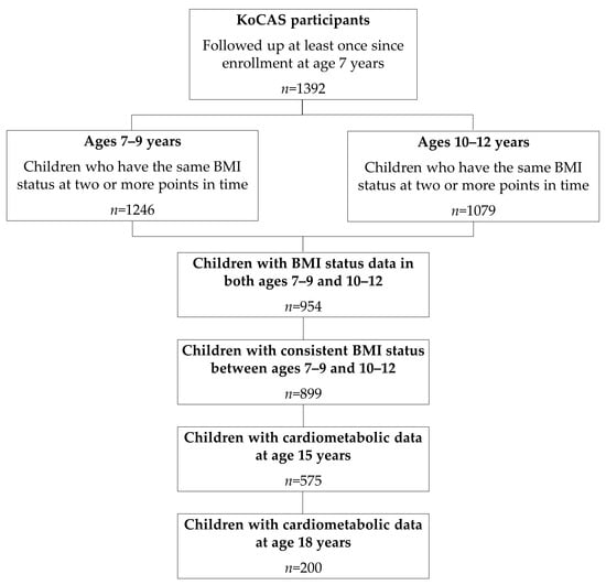 For the present study, we used data from the Korean Children-Adolescents Study (KoCAS) conducted by the National Institute of Health (NIH) [14]. To comprehensively investigate the growth patterns of Korean children, an open cohort design was employed, enrolling participants aged 7 years. Annual follow-up assessments were conducted from 2005 to 2020 (excluding 2015) in selected regions of Seoul and Gyeonggi-do, Korea. Participants were recruited from first-grade classes in elementary schools (age 7) in these regions as part of a school-based prospective study. All students were invited to participate, and the final study sample included only those who voluntarily agreed to take part in the study. A total of 1392 children were followed at least once after enrollment at age 7. Among them, 954 children had complete BMI data across two periods: ages 7–9 years and 10–12 years. Of these, 899 children who maintained the same BMI classification (normal or overweight) across both periods were included in the final analysis. Participants whose classification differed between the two periods were considered to have an inconsistent BMI status and were excluded, as defined in Section 2.5. Among them, 575 children (63.96%) had cardiometabolic measurements at age 15, and 200 children (22.25%) had cardiometabolic measurements at age 18 (Figure 1). The study was approved by the Institutional Review Board of the Korea Disease Control and Prevention Agency. Informed consent was obtained from all participating children and their parents.