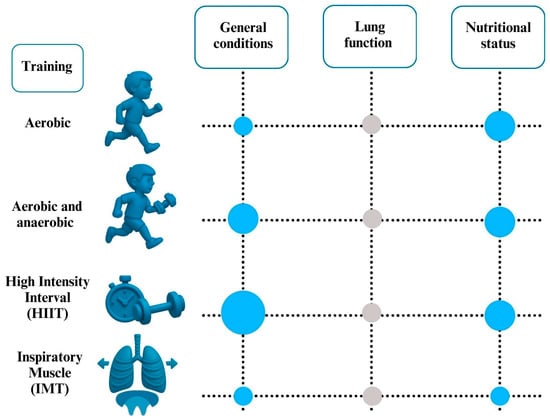 The main findings of the studies reviewed. Positive (blue) and irrelevant (grey) relationship between type of training and outcomes in children and adolescents with CF.