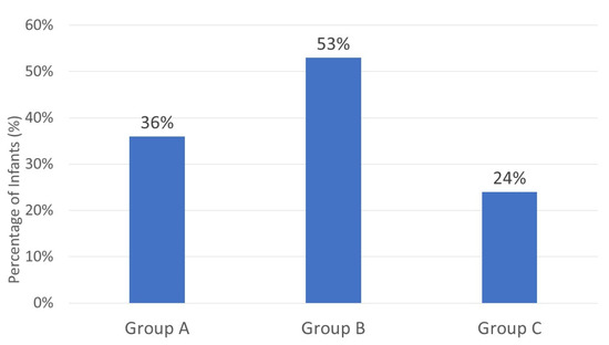 A total of 103 infants were included in this study and divided into three groups: Group A (n = 33), Group B (n = 36), and Group C (n = 34).