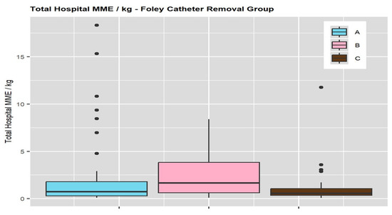 Total opioid administration was reported as intravenously, MME (mg/kg). Group A (Foley catheter was removed before the epidural was discontinued), Group B (Foley catheter was removed after the epidural was discontinued), and Group C (no Foley catheter placement).