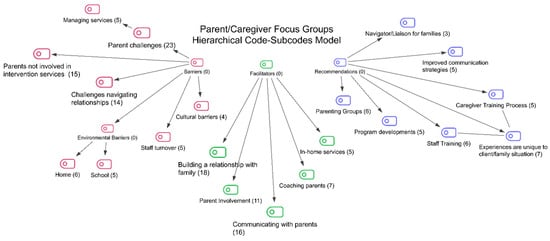 Codes were developed and modified throughout the coding process using the qualitative data analysis software MAXQDA 24 (MAXQDA 2024 VERBI Software, 2024) [21]. Once all the data had been coded, the team members began to iteratively generate themes that described patterns observed in the data that could be used to further group similar codes together and to look for opportunities to meaningfully create overall themes that cross-cut the three groups interviewed. Code and themes lists were generated, and after several iterations, the codes and initial themes fell under three main themes: (1) barriers to parent/caregiver involvement in applied behavioral analysis programming, (2) facilitators of parent/caregiver involvement in applied behavioral analysis programming, and (3) recommendations for improving parent/caregiver involvement in applied behavioral analysis programming. These themes and related codes are shown in Figure 1.