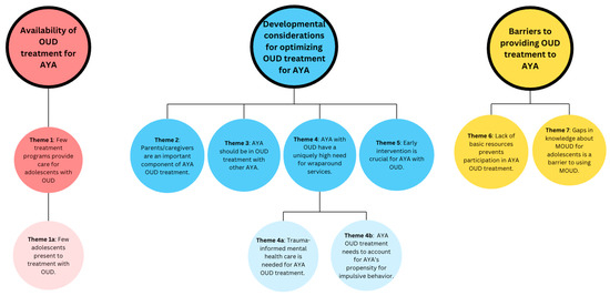 Through template-style thematic analysis, seven themes emerged, along with three subthemes. These themes are organized based on the three main areas of interest of our study. The first theme describes the availability of OUD treatment for AYA. The second, third, fourth, and fifth themes discuss developmental considerations for optimizing OUD treatment for AYA. The sixth and seventh themes describe barriers to providing OUD treatment for AYA. Figure 1 provides a summary of all themes organized into these three main areas of interest.