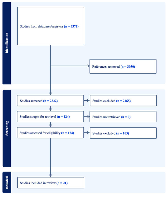 The search yielded 5372 articles for screening, with 3050 duplicate references removed. In total, 2322 studies underwent title and abstract screening, 124 full texts were reviewed based on the inclusion and exclusion criteria, and 21 studies were included in data extraction, quality appraisal, and synthesis (see Figure 1). In total, 103 studies were excluded for the following reasons: PA and SA were analysed separately or as a part of cumulative behaviours (n = 47, 45.6%); inappropriate study design, such as PhD dissertations or book chapters (n = 24, 23.3%); irrelevant outcome measures, for example, sedentary behaviour (n = 20, 19.6%); and inability to access study or language other than English (n = 11, 10.7%). Of note, one study by Cho [56] was excluded at the full-text review stage due to its unresolvable differences in methodology and results.