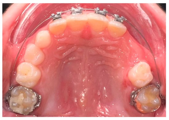 This occlusal view of the 2 × 4 fixed orthodontic appliance illustrates the archwire’s alignment, the brackets’ positions on the incisors, and the molar bands providing posterior anchorage.