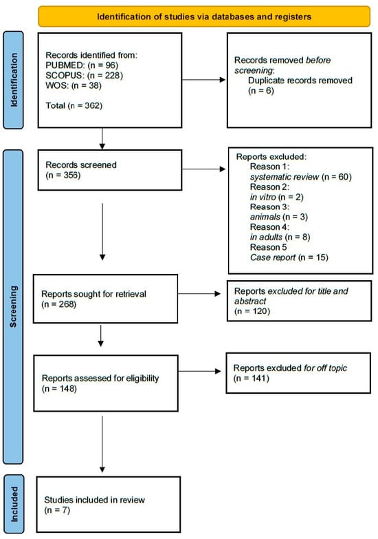 This PRISMA (Preferred Reporting Items for SR and Meta-Analyses) diagram (Figure 3) illustrates that a rigorous and systematic selection process was followed to ensure that only relevant studies were included in the final review. A literature search was conducted across three electronic databases: PubMed, Scopus, and Web of Science. This search initially yielded a total of 362 records (96 from PubMed, 228 from Scopus, and 38 from Web of Science). After 6 duplicate entries were removed, 356 unique articles remained for screening. During the initial screening based on titles and abstracts, 88 articles were excluded for various reasons: 60 were SRs, 2 were in vitro studies, 3 involved animal models, 8 focused on adult populations, and 15 were case reports. As a result, 268 articles were considered potentially relevant and thus selected for full-text retrieval. Following this, 120 of these articles were excluded after a more detailed title and abstract evaluation, leaving 148 full-text articles to be assessed for eligibility. Upon thorough review, 140 articles were excluded because they were off-topic or did not align with the inclusion criteria established for this review. Ultimately, seven studies met all the eligibility criteria and were included in the final analysis. The selection process and a summary of the included records are illustrated in Figure 3, while the characteristics of the selected studies are presented in Table 2.