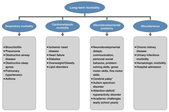 After mounting evidence identified late-preterm and early-term delivery as a significant risk factor for various neonatal complications, concerns for the potential long-term adverse effects of delivery before 39 weeks began to surface. Unfortunately, those concerns were well-founded, as the latest research has demonstrated associations between delivery before 39 weeks and many long-term respiratory, cardiovascular, renal, hematologic, neurologic, psychiatric, and behavioral complications in later life (Figure 2) [98].