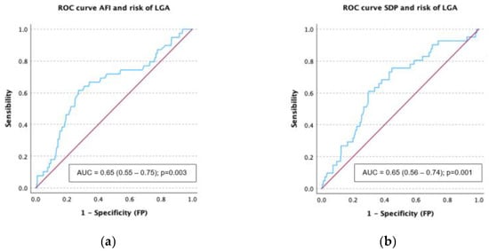 ROC curves were created to assess the diagnostic performance of AFV measurements regarding the development of macrosomia and LGA. For both AFI and SDP, the AUC for LGA detection was 0.65, with a 95% confidence interval of 0.55–0.75 and 0.57–0.74, respectively (Figure 3). Using a threshold of 17.1 cm for AFI yields a sensitivity of 61.5% and a specificity of 72.7% for detecting LGA, while a cutoff of 6.1 cm for the SDP results in a sensitivity of 61% and a specificity of 70.1%.