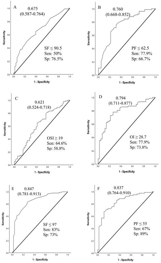 We have used OSI for regression analysis as there was no missing data. In addition, the OSI is useful for clinical practice as it can be calculated in neonates without an arterial line. An arterial line was not placed or could not be placed in a few neonates in our study. In such situations, the SF ratio or OSI can be used to decide on transfer and ECMO cannulation. The SF and OSI metrics have been validated as indices of the severity of hypoxic respiratory failure in pediatric respiratory failure [10,11,23]. We are presenting the comparative predictive values for SF and OSI, along with arterial blood gas-based oxygenation indices.