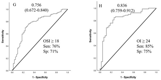 Receiver operating curves for oxygenation indices at time A and time B to predict the need for ECMO support. Area under the ROC curve (95% CI). (A–D): values at PICU arrival; (E–H): values at 4 h after PICU arrival. Abbreviations: SF—SpO2/FiO2 ratio; PF—PaO2/FiO2 ratio; OSI—oxygen saturation index; OI—oxygenation index.