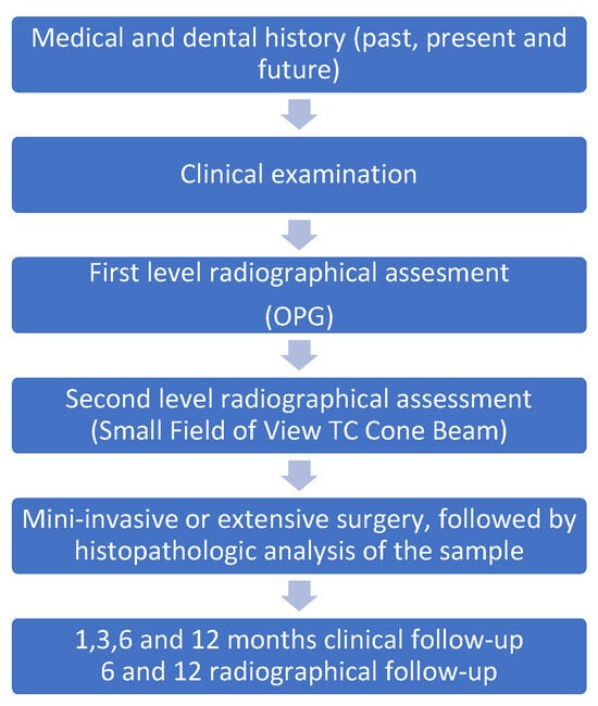 Clinical follow-up was established at 1, 3, 6, and 12 months for the first year, and yearly from the second year. Radiographic follow-up was scheduled for 6 and 12 months with OPT and CBCT. The diagnostic-therapeutic procedures are listed below (Figure 1).