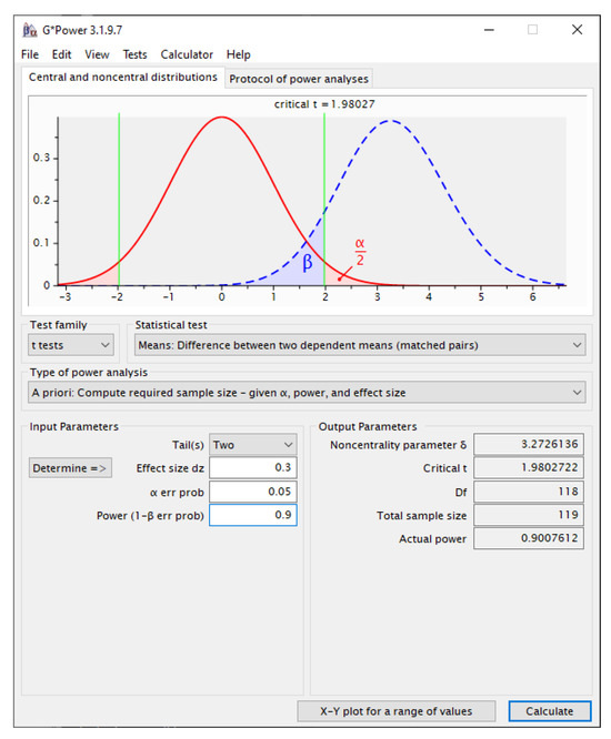 With these specifications G*Power (version 3.1.9.7) returned a non-centrality parameter δ = 3.27, a critical t of 1.98, and a required total sample size of 119 paired observations (df = 118) to detect the target effect (Figure 1).