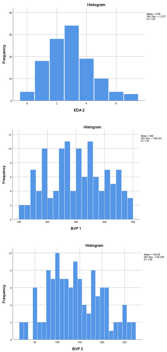 EDA differences deviated from normality, W = 0.88 and p < 0.001, whereas BVP differences were approximately normal, W = 0.98 and p = 0.059. Given the large sample size, the paired-samples t-test was judged sufficiently robust to these departures (Figure 2).