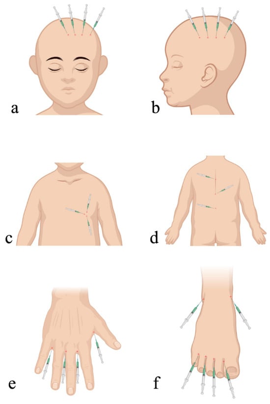 The selection of ICG injection points for cLM at the (a) face, (b) neck, (c) chest, (d) abdomen or back, (e) upper extremity, and (f) lower extremity. ICG, indocyanine green; cLM, cystic lymphatic malformation. Image drawn by Tao Han using BioRender.com.