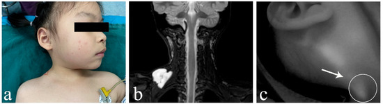 - Chen, W.; Luan, J.; Xu, H.; Chen, J.; Xu, R.; Sun, G.; Li, X. Ultrasonography findings of pediatric head and neck lymphatic malformations: A 10-year experience of 140 surgical cases. J. Clin. Ultrasound 2024, 52, 1288–1295. [Google Scholar] [CrossRef]