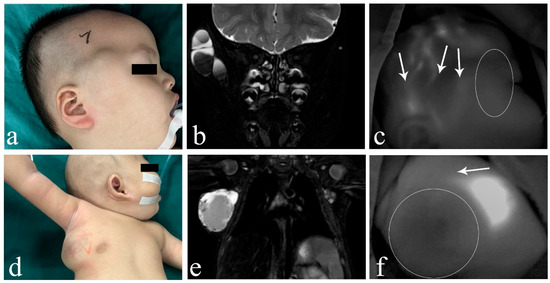 Images of macro/mixed cLM with ICH. (a) A 2-year-old male patient with macro cLM of the right temporal region. (b) Preoperative MRI indicated macro cysts with ICH. (c) Intraoperative ICG lymphography finding without any inflow draining into the lesion. (d) A 2-month-old male patient with mixed cLM of the right chest. (e) Preoperative MRI indicated mixed cysts with ICH. (f) Intraoperative ICG lymphography finding without any inflow draining into the lesion. Arrow head, lymph vessel; circle, region of the lesion. cLM, cystic lymphatic malformation; ICH, intracystic hemorrhage; MRI, magnetic resonance imaging; ICG, indocyanine green.