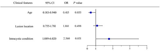 The statistical analysis was performed with SPSS Statistics 22.0 (IBM Corp., Armonk, NY, USA). Categorical data, presented as n (%), were analyzed using a Chi-square test or Fisher’s exact test (expected counts were ≤5). The normality of the data was assessed using the Shapiro–Wilk test in this study, and continuous variables were expressed as mean ± standard deviation (SD). An independent two-sample t-test was performed for parametric comparisons. Univariate analysis was performed using a Chi-square test to evaluate the associations between gender, age, histological typing, lesion location, lesion maximum diameter, intracystic condition, and excellent outcome. With excellent outcome as the dependent variable, variables with a p-value < 0.05 in the univariate analysis were retained for multivariable binary logistic regression, and were presented using a forest plot. Differences were considered to be statistically significant at a p-value < 0.05.