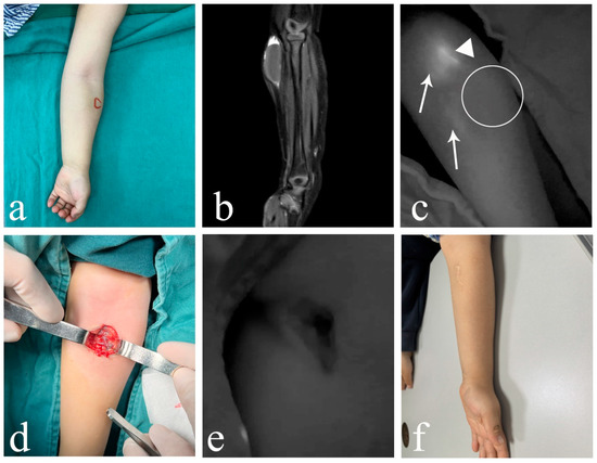 A 2-year-old male patient suffered from macro cLM with ICH in left forearm. (a) Clinical appearance preoperatively. (b) Preoperative MRI indicated macro cysts with ICH. (c) ICG lymphography showing that one lymph vessel on the ulnar side of the left forearm bypassed the lesion and flowed into the cubital fossa lymph node. No communication between lymph vessel and the lesion cite was observed. (d) Gross observation of ICH intraoperatively. (e) No ICG was found inside the lesion. (f) Twelve months postoperatively, complete regression of cLM met the criterion of excellent curative effect. Arrow head, lymph vessel; circle, region of the lesion; triangle, lymph node. cLM, cystic lymphatic malformation; ICH, intracystic hemorrhage; MRI, magnetic resonance imaging; ICG, indocyanine green.