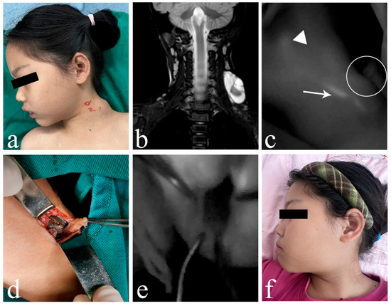 A 7-year-old female patient suffered from mixed cLM with ICH in left neck. (a) Clinical appearance preoperatively. (b) Preoperative MRI indicated mixed cysts with ICH. (c) ICG lymphography showed that one lymph vessel from posterior auricular region bypassed the lesion, and no communication between lymph vessel and the lesion cite was observed. (d) Gross observation of ICH intraoperatively. (e) No ICG was found inside the lesion. (f) Sixteen months postoperatively, complete regression of cLM met the criterion of excellent curative effect. Arrow head, lymph vessel; circle, region of the lesion; triangle, lymph node. cLM, cystic lymphatic malformation; ICH, intracystic hemorrhage; MRI, magnetic resonance imaging; ICG, indocyanine green.