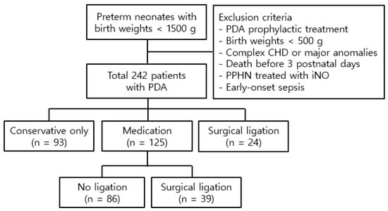 A total of 242 preterm neonates diagnosed with PDA were enrolled, consisting of 120 boys and 122 girls, with a mean gestational age and birth weight of 27.9 ± 2.2 weeks and 1034.3 ± 239.3 g, respectively (Figure 1). Among these patients, 93 received conservative treatment, while 149 underwent aggressive treatment, including medical intervention in 125 patients and surgical intervention in 24 patients. Of the 125 patients treated medically, 39 required subsequent surgery due to an inadequate response to pharmacotherapy. Medical treatment was initiated at 15.1 ± 4.7 days postnatally, while surgical treatment was performed at 17.9 ± 10.6 days postnatally. Patients requiring surgery after failed pharmacotherapy underwent the procedure at 18.0 ± 8.8 days postnatally.