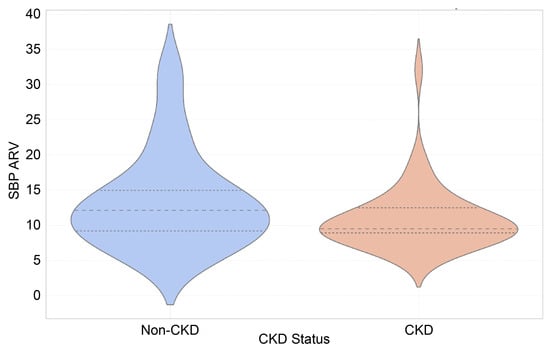 Violin plot of systolic blood pressure average real variability (SBP ARV) across CKD and non-CKD groups.