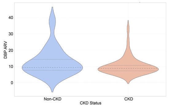 Violin plot of diastolic blood pressure average real variability (DBP ARV) across CKD and non-CKD groups.
