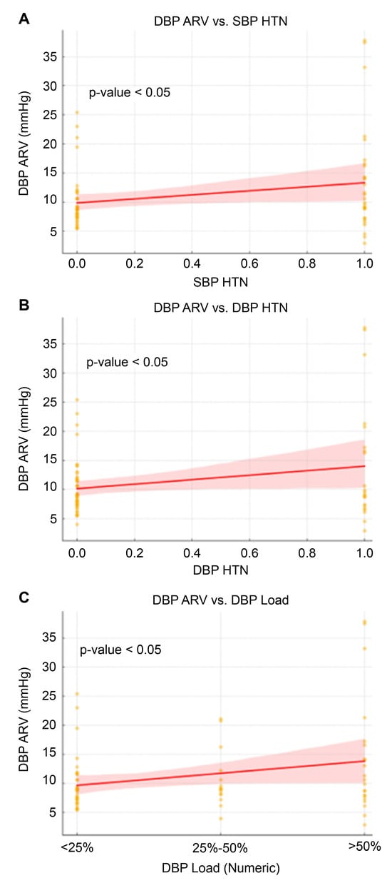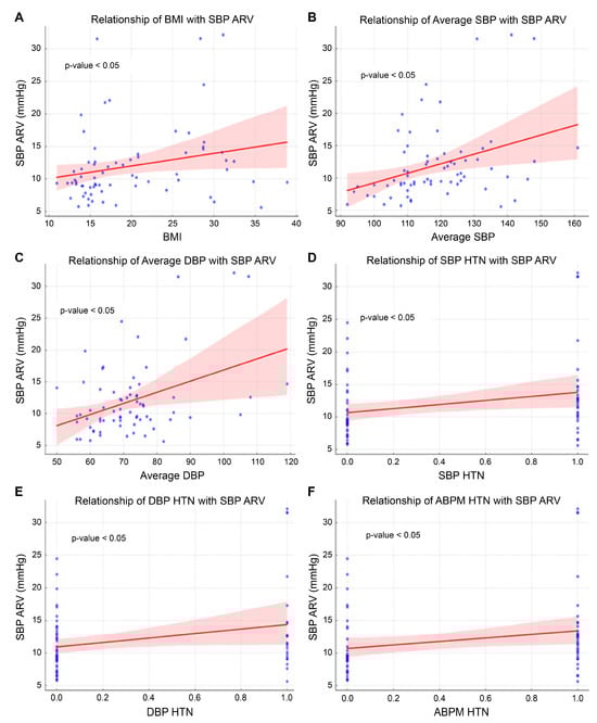 Linear regression analysis identified overall systolic and diastolic blood pressure as significant predictors of SBP ARV, with coefficients of 0.148 (95% CI: 0.054–0.241, p = 0.002) and 0.175 (95% CI: 0.079–0.271, p = 0.001), respectively (Figure 3). Additionally, the presence of systolic blood pressure hypertension (SBP HTN) and diastolic blood pressure hypertension (DBP HTN) was significantly associated with higher SBP ARV values, with coefficients of 3.112 (p = 0.024) and 3.432 (p = 0.019), respectively (Table 2).