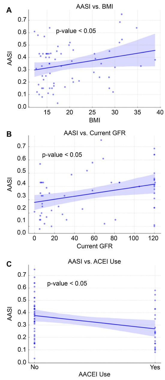 The regression analysis of the AASI identified BMI and current GFR as significant predictors. Specifically, an increase in BMI was associated with an increase in AASI (B = 0.006, 95% CI: 0.001 to 0.012, p = 0.048), suggesting that higher BMI may contribute to increased arterial stiffness (Table 4 and Figure 5). Additionally, a positive association was found between current GFR and AASI (B = 0.001, 95% CI: 0.000 to 0.002, p = 0.006), indicating that better kidney function is associated with increased arterial stiffness levels.