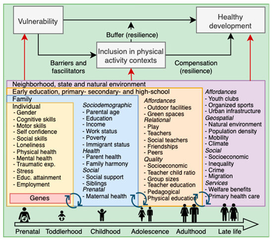 Inclusion in motion is a multidetermined, developmental process that unfolds from early childhood and across the life course. It is shaped by the interplay of genetic, biological, individual, family, and neighborhood factors [50,51]. Children with physically active parents are more likely to engage in movement-based contexts [52], and PA levels are moderately genetically heritable [53], indicating the relevance of both environmental and biological scaffolds.