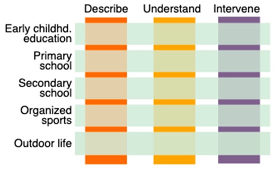 Efforts should especially focus on children and adolescents at heightened risk of marginalization due to factors such as a socioeconomic disadvantage, disability, refugee or immigrant background, minority status, gender identity, mental health challenges, or exposure to trauma [49]. The describe, understand, and intervene (see Figure 2) steps can guide such efforts. First, it is essential to systematically identify and describe existing inequalities, barriers, and facilitators for participation in PA across different settings and developmental stages. Second, there is a need for deeper understanding of the causal processes through which vulnerability and PA interact over time to influence long-term outcomes such as health, educational attainment, and work inclusion. Third, targeted interventions must be developed to address these barriers and disrupt potential cascades of disadvantage, ideally through context-sensitive and participatory approaches that involve stakeholders across sectors.