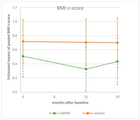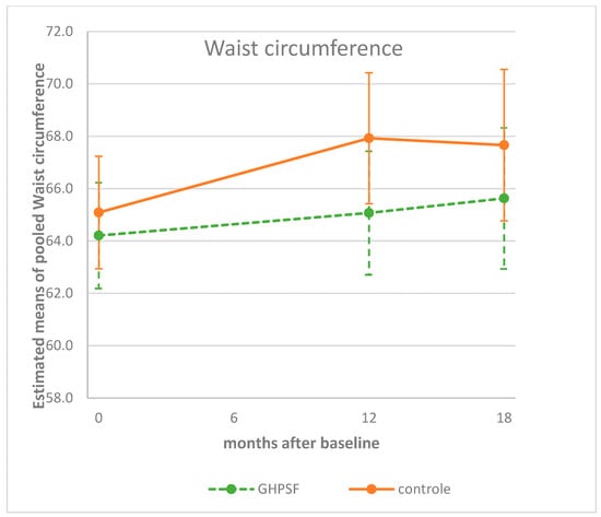 Waist circumference was not significantly different between the groups after 1 year of follow-up in the intervention group (p = 0.057) or at the 18-month follow-up (p = 0.235) (Table 2). Estimated data after 12 months show an increase in waist circumference in comparison with the baseline in both groups (Δz-score: 0.861 versus 2.837) (Figure 3). After 18 months, this increase from the baseline was still present in the GHPSF (Δz-score: 1.421 cm) as well as in the control schools (Δz-score: 2.573 cm) (Figure 3).