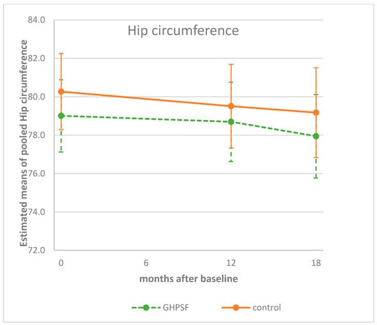 For hip circumference, changes between groups were minimal. At 12 months, the intervention effect was 0.45 cm (95%CI: −1.10, 2.00; p = 0.567), and at 18 months, it was 0.03 cm (95%CI: −1.80, 1.87; p = 0.970), indicating no clear difference in hip circumference changes between the intervention and control groups (Figure 4).