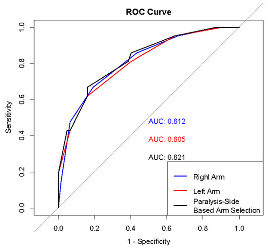 In the ROC analysis comparing measurements from different limbs, no statistically significant difference was found between the AUC values for the right arm, left arm, and the arm determined according to paralysis status (p > 0.050) (Figure 1), (Table 3 and Table 4).