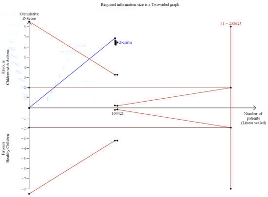 Trial Sequential Analysis (TSA) for attention deficit comparing children with asthma to healthy controls. The cumulative Z-curve (blue line) crosses the conventional significance boundary and the trial sequential monitoring boundary, indicating that the pooled evidence is sufficient to confirm a statistically significant difference in attention deficit without risk of random error. The required information size (RIS) is represented by the vertical red line, and the monitoring boundaries are plotted in red. This analysis confirms the robustness of the finding that children with asthma exhibit higher attention deficit than healthy peers.
