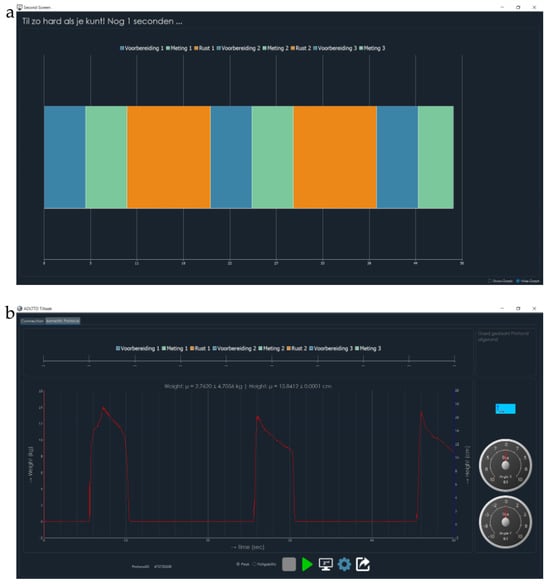 Screens shown during the test. (a) Display seen by the participant. Blue time zone: preparation time of five seconds. Green time zone: measurement time of five seconds. Orange time zone: recovery time of ten seconds (partially shown). (b) Display seen by the tester: an overview of two maximum force measurements. The blue line shows object height from the tabletop; the red line shows applied force over time.