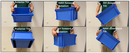 The second outcome is the mean position of the box relative to the x, y, and z axis, measured in degrees, using an IMU in the maximal zone. Figure 4 shows the graphs of strength and the x, y, and z angles against time. The maximal zone is defined as the zone from 80 to 100% of the MVC, in which maximal contraction of the muscle fibers occurs. The starting position of the box, and thus the IMU, was established as the tabletop of the ADL-TTD, which served as the reference or 0-position. Throughout the measurement, including the lifting, MVC, and repositioning of the box on the tabletop, the IMU continuously monitored the movement of the box about the three axes. During the lifting task, six directions of movement were recorded using the IMU: anterior/posterior tilt, forward rotation on both the affected and non-affected sides, and downward tilt on both sides. We chose to focus our analysis on three directions—posterior tilt, forward rotation on the non-affected side, and downward tilt on the affected side—because these were most commonly seen in clinical practice and during pilot testing. This decision was based on expert opinion from pediatric rehabilitation clinicians and an initial visual inspection of the full dataset. The other three directions were also recorded but are not included in the current analysis. We plan to explore them in future studies (shown in Figure 5).