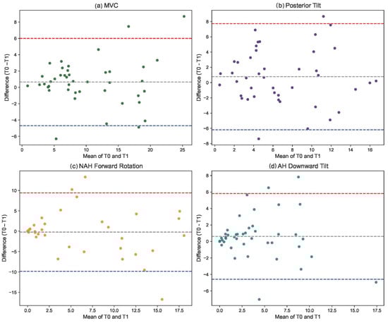 Bland–Altman plot based on original data. (a) MVC value; (b) posterior tilt; (c) NAH forward rotation; (d) AH downward tilt).