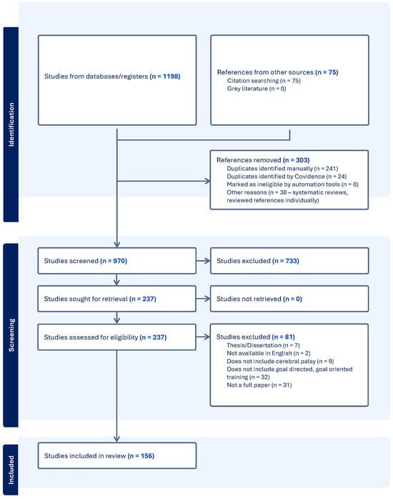 - Shierk, A.; Roberts, H.; O’Brien, A.; Thias, B.B. Scoping Review of Goal Directed Therapy for Youth with Cerebral Palsy. 2023. Available online: https://osf.io/5t3bq (accessed on 1 April 2023).