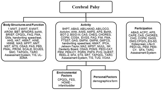 | Quality of Upper Extremity Skills Test (QUEST) | 10 | [32,39,40,43,61,62,67,72,94,106] |