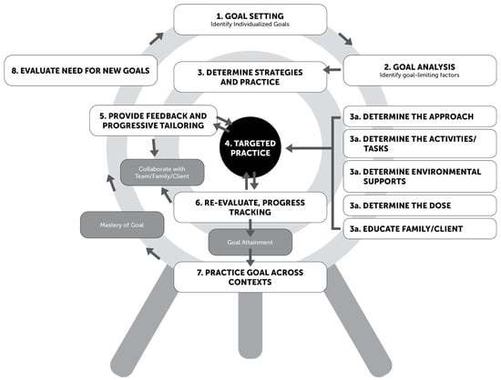 | 4. Targeted Practice of the Skill/Goal | Family-centered (especially at home), Specific training techniques, Therapy dose, Social engagement (depending on if their goal is social or performed in social contexts), Multidisciplinary approach | |