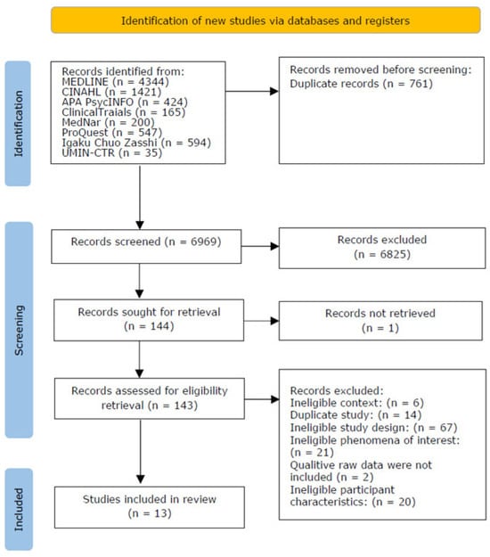 After duplicates were excluded, the initial search produced 6969 articles, of which 15 met the inclusion criteria; these were critically appraised for their methodological quality. One article with a score under 70% was excluded. Two studies were rated unclear in terms of question 8 of the JBI critical appraisal checklist (“Are participants and their voices adequately represented?”) because they did not include the raw qualitative data. The authors of those two articles were contacted to provide additional information; the authors of one article provided the raw data. Overall, 13 qualitative studies were included for review [23,24,25,26,27,28,29,30,31,32,33,34,35]. The PRISMA diagram [20] is presented in Figure 1. The study characteristics are provided in Table 1.