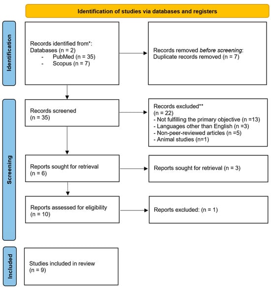 The PRISMA flow diagram illustrates the study selection process (Figure 1). A total of 42 records were initially retrieved (35 articles from PubMed and 7 articles from Scopus), out of which 7 were excluded due to duplication, leaving 35 articles for screening. Based on title and abstract screening, 22 studies were excluded, leaving 15 articles. Of these, 6 were sought for retrieval, but 3 full-text articles could not be retrieved. The remaining 10 full-text articles were assessed for eligibility. In total, 1 out of 10 articles did not meet the inclusion criteria and was excluded from the review.