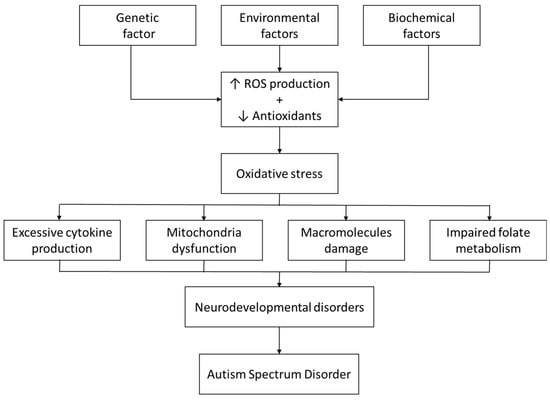 Oxidative stress arises from an imbalance between ROS production and the cell’s antioxidant defenses, either due to increased ROS generation or compromised antioxidant systems. This imbalance, along with the resulting biochemical alterations in macromolecules and dysfunctional mitochondria, are implicated in various pathological conditions and human diseases [41,42]. The developing brain is particularly more susceptible to oxidative stress, which is the cornerstone event in all pathways implicated in the development of neurodevelopmental disorders [43]. Markers of oxidative stress such as lipid peroxide, malondialdehyde (MDA), protein carbonyl, and 3-nitrotyrosine (3-NT), 8-hydroxydeoxyguanosine (8-OHdG) are elevated in children with ASD [44,45]. However, low levels of antioxidant proteins such as transferrin and ceruloplasmin have been reported in children with ASD [46].