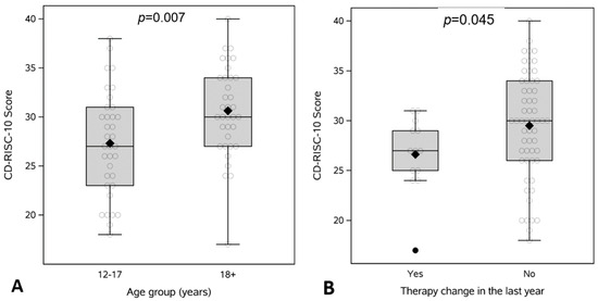 CD-RISC-10 Resilience scores comparing (A) adolescents (12–17 years) to young adults (≥18) and (B) presence of therapy change in the prior year.