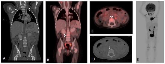Three-year-old female with histologic diagnosis of LCH. (A,D) Coronal and axial CT images show an initially missed small lytic lesion at L4 measuring 4.5 mm (white arrows). (B,C) Fused and whole-body 18F-FDG PET/CT images demonstrate increased FDG activity in the L4 lytic lesion (black and white chevrons). (E) Additional lesions in skull, mandible, and thymus are noted in the whole-body 18F-FDG PET/CT (black arrows).