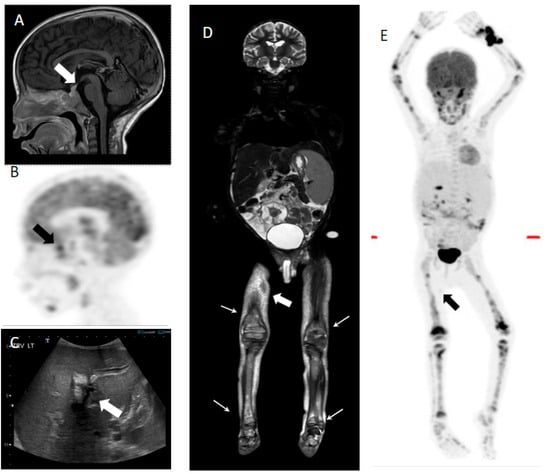 Seven-year-old male with multisystem LCH. (A) Sagittal T1 post-contrast image shows thickening and enhancement of the pituitary stalk (white arrow). (B) FDG PET shows increased uptake in the sellar region (black arrow). (C) Transverse ultrasound image shows hepatomegaly and increased periportal echogenicity/edema (white arrow). (E) Whole-body coronal STIR MRI image shows hepatosplenomegaly, ascites, multifocal areas of increased signal in the bone marrow (white arrows), and cutaneous involvement (white filled arrow). (D) MIP PET image demonstrates multifocal avid FDG disease involving the axial and appendicular skeleton. Mild focus of uptake is seen in the right mid-thigh, corresponding to a subcutaneous lesion (black arrow). Biopsy of the skin lesions was positive for LCH.
