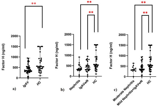 Serum complement factor H (ng/mL) in children with IgAV and HCs. (a) Comparison of factor H levels between IgAV patients and HCs. (b) Comparison of factor H levels among three groups: patients with nephritis, IgAVwN, and HCs. (c) Comparison of factor H levels between nephritis severity subgroups (mild and moderate nephritis), IgAVwN, and HCs. IgAV: immunoglobulin A vasculitis; IgAVwN: IgAV without nephritis; HCs: healthy controls. Data are expressed as medians and analyzed using the Mann–Whitney U test and Kruskal–Wallis test with Dunn’s multiple comparison test. ** p < 0.05.