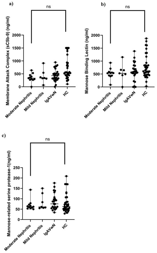 Serum complement concentrations in patients with IgAVwN, mild nephritis, moderate nephritis, and HCs. (a) Membrane attack complex (sC5b-9) (ng/mL). (b) Mannose-binding lectin (ng/mL). (c) Mannose-related serine protease-1 (ng/mL). IgAVwN: immunoglobulin A vasculitis without nephritis; HCs: healthy controls; ns: not significant. Data are expressed as medians and analyzed using the Kruskal–Wallis test with Dunn’s multiple comparison test. ns: p > 0.05.