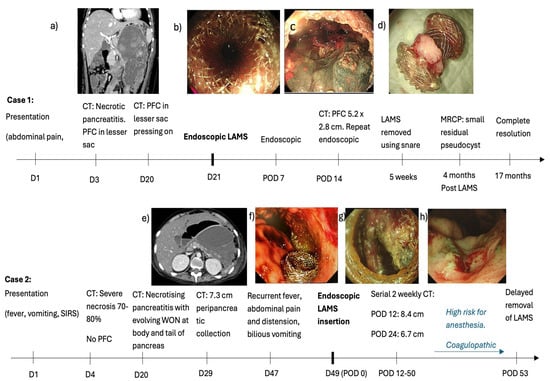 Clinical course of two cases of acute pancreatitis with pancreatic fluid collections (PFCs). (a) Day 20 CT scan showing a large PFC abutting the stomach, causing a significant mass effect (b) Endoscopic ultrasound (EUS)-guided cysto-gastrostomy on Day 21 using a Boston Hot AXIOS LAMS (10 length × 15 mm diameter). (c) Necrosectomy repeated 14 days later (d) LAMS removed at 5 weeks (e) CT scan shows an enlarging PFC causing compression and anterior displacement of stomach. (f) LAMS deployed on day 49 of illness. (g) Endoscopic necrosectomy performed for persistent WON 50 days after LAMS insertion. (h) Patent healthy cystogastrostomy tract after removal of LAMS..