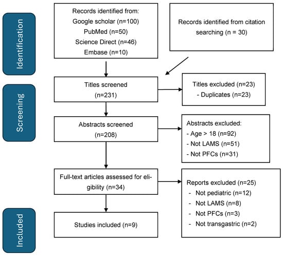 Our literature search produced 231 records, of which 23 were duplicates. Through titles and abstract screening, a further 174 reports were excluded as per the following criteria: adult population (patients aged >18 years), reports of LAMS use for indications other than for drainage of PFCs, drainage conducted through the oesophagus, and reports of other methods of PFC drainage not attributed to LAMSs. The full text of the remaining 34 reports was reviewed and analysed. Only reports describing cases or case series of LAMS deployment for trans-gastric drainage of PFC (for both WON and pancreatic pseudocyst) in children ≤ 18 years were included. There were 9 studies that fulfilled the inclusion criteria after full-text review (Figure 2) (Table 1). All studies met the majority of the JBI checklist items; common limitations are in line with the nature of case reports and small case series, such as a lack of consecutive case inclusion. (Supplemental Material). There were two studies from the same author, one with single-institution and one with multi-institutional experience [,]. From a review of the two studies, we could identify five individual children who are included in this systematic review (Table 1).