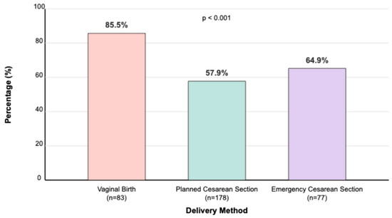 Breastfeeding is universally recognized as a cornerstone of maternal and child health, providing optimal nutrition, enhancing immunity, and supporting cognitive and physical development in infants. It also confers significant maternal benefits, including a reduced risk of postpartum hemorrhage, certain cancers, and metabolic disorders [1,2]. Consequently, global health authorities such as the WHO and UNICEF recommend exclusive breastfeeding for the first six months and continuation up to two years or beyond, aligning with Sustainable Development Goals (SDGs) targeting child survival and well-being [3,4]. However, global rates of exclusive breastfeeding remain below the 60% target set for 2030, reflecting ongoing challenges in achieving equitable breastfeeding practices worldwide [5]. Delivery method has emerged as a key determinant of breastfeeding outcomes. Vaginal delivery facilitates immediate mother–infant bonding through natural hormonal surges, such as oxytocin release, which enhances lactation [6]. In contrast, cesarean section (C/S)—whether planned (elective) or performed emergently—can interfere with these physiological processes. Planned C/S, often scheduled before the onset of labor, lacks the hormonal priming of vaginal delivery, whereas emergency C/S, performed after labor begins, may partially preserve these effects but is frequently complicated by maternal fatigue, anesthesia, and surgical stress [7,8].
